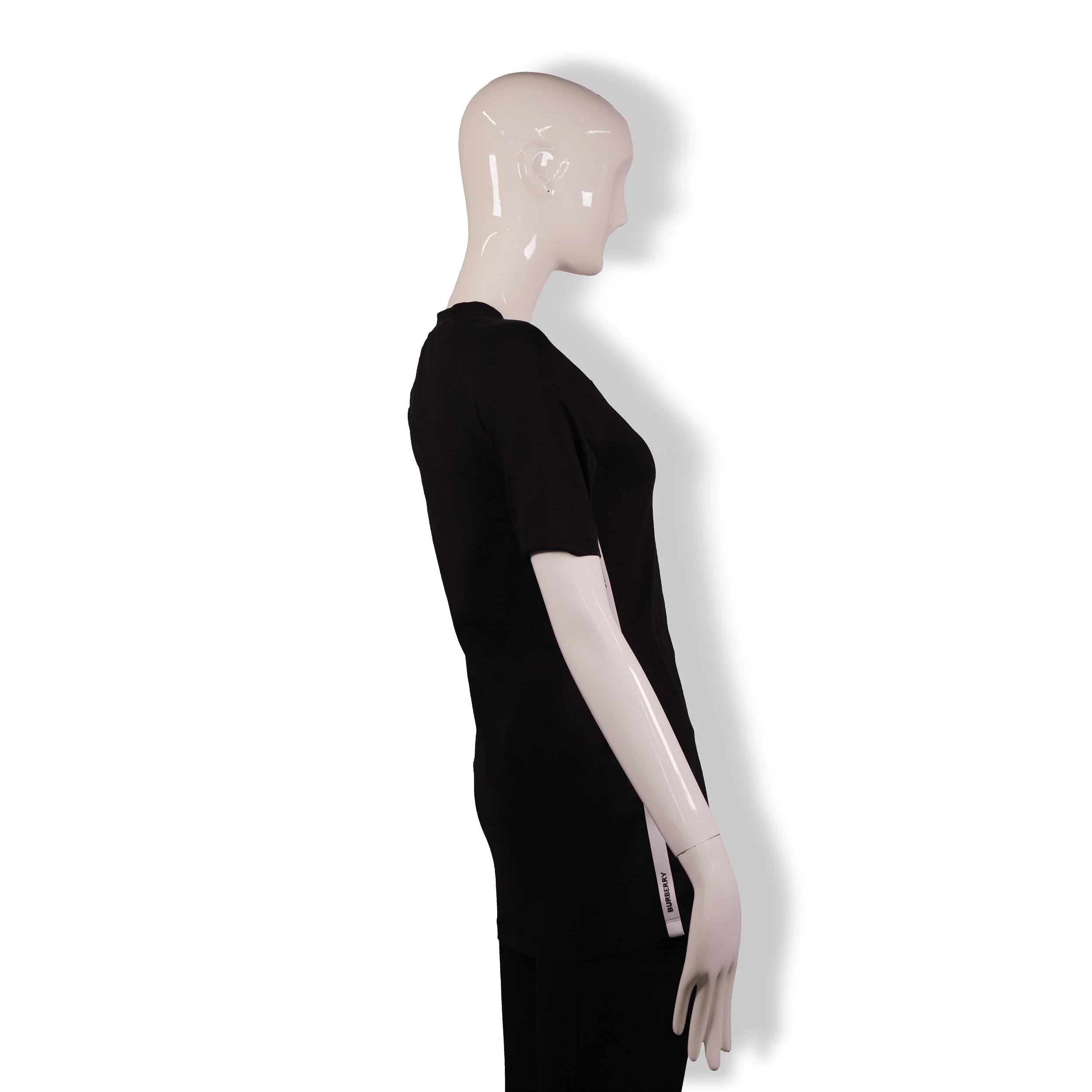 This Burberry tee is crafted in a sleek black stretch-knit cotton with subtle white stripe detailing along the sides for a clean, modern athletic-inspired look. The streamlined silhouette, raglan sleeves, and minimalistic branding create a versatile top that pairs effortlessly with denim, leggings, or layered jackets. Lightweight and comfortable, it’s an elevated everyday essential with Burberry’s signature understated luxury.