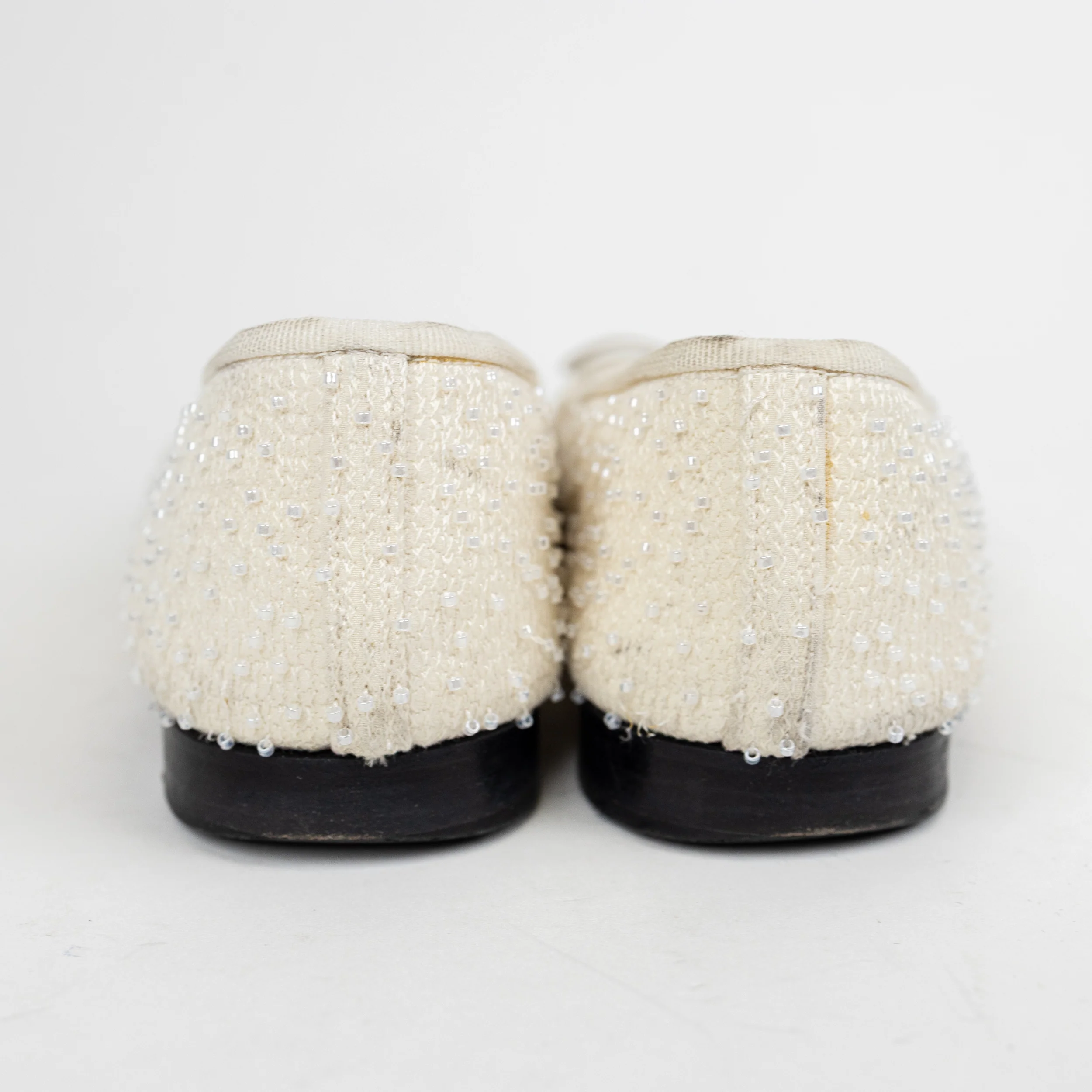 Chanel White Cream Tweed Pearl Beaded CC Cap Toe Ballet Flats Size 36.5