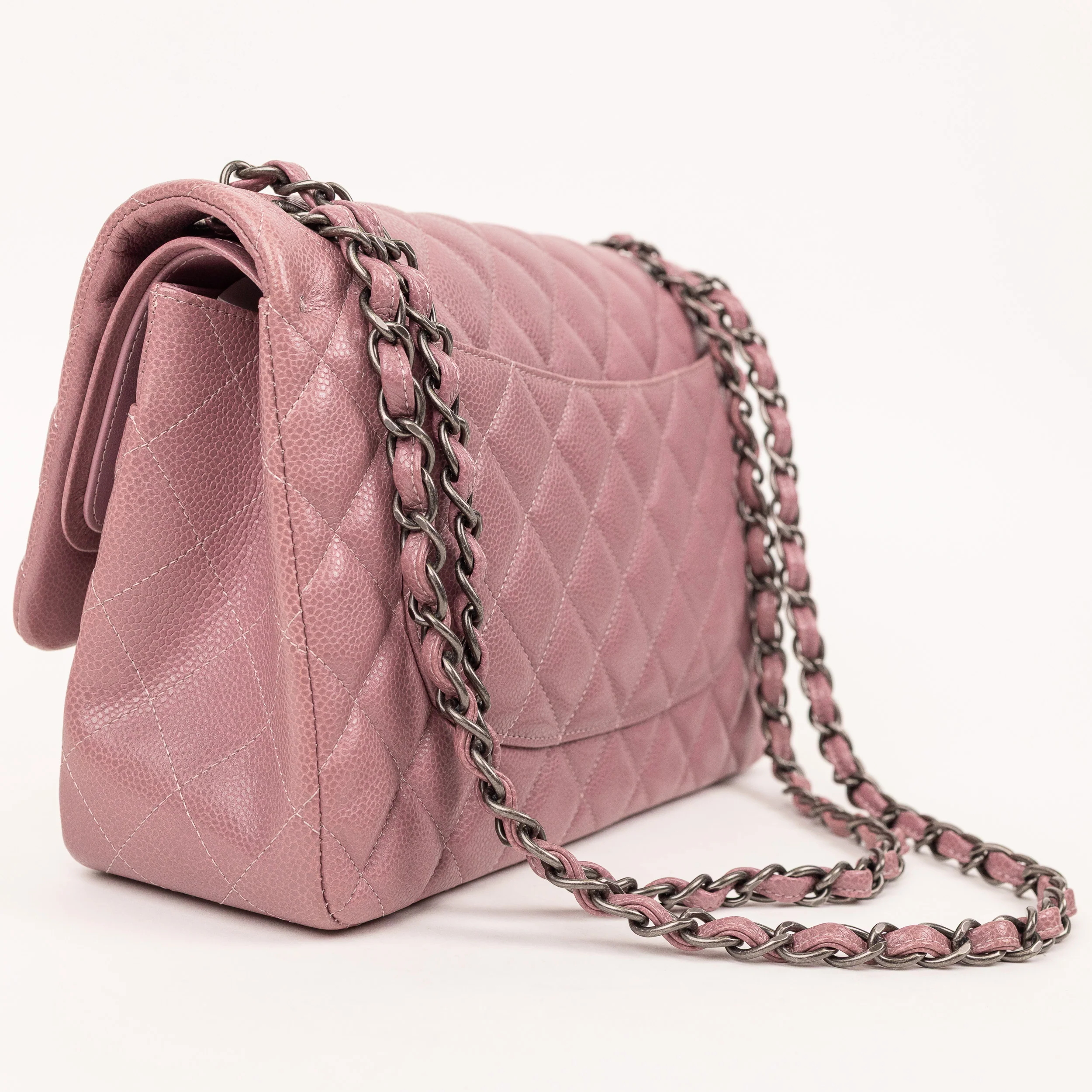 Chanel’s Jumbo Caviar Double Flap in luminous purple grained leather features silver-tone/black hardware (as shown) and classic quilted design, threaded leather-chain strap, and dual compartment flap structure for timeless elegance.