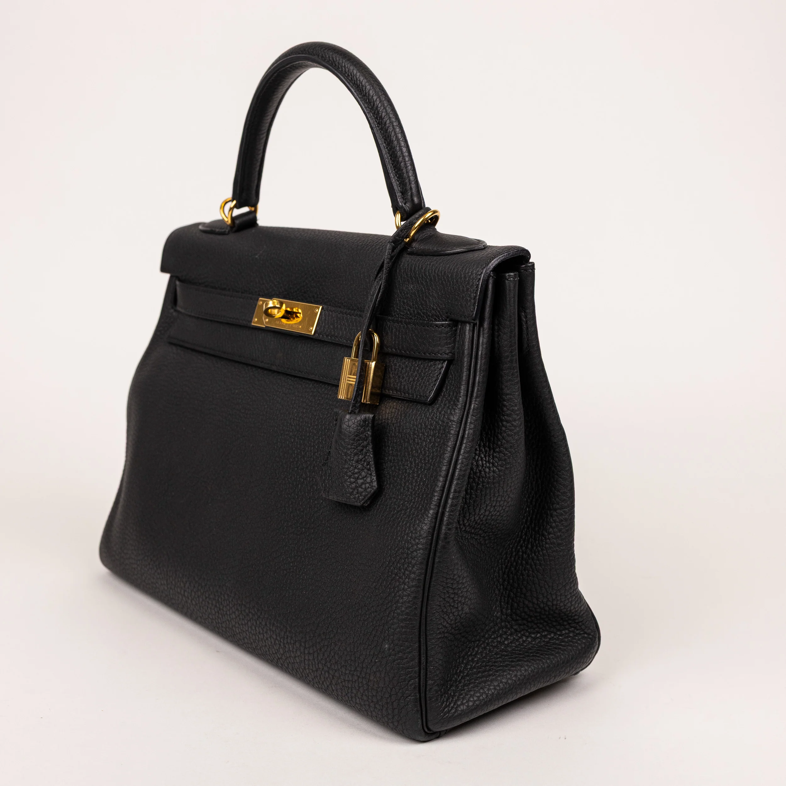 Crafted in Togo leather, this Black 32cm Kelly bag features gold-tone hardware, retourne construction, leather top handle, removable shoulder strap, single straight flap with palladium turret. It also sports interior slip and zippered pocket with a leather zipper pull. Comes with clochette and 2 keys.