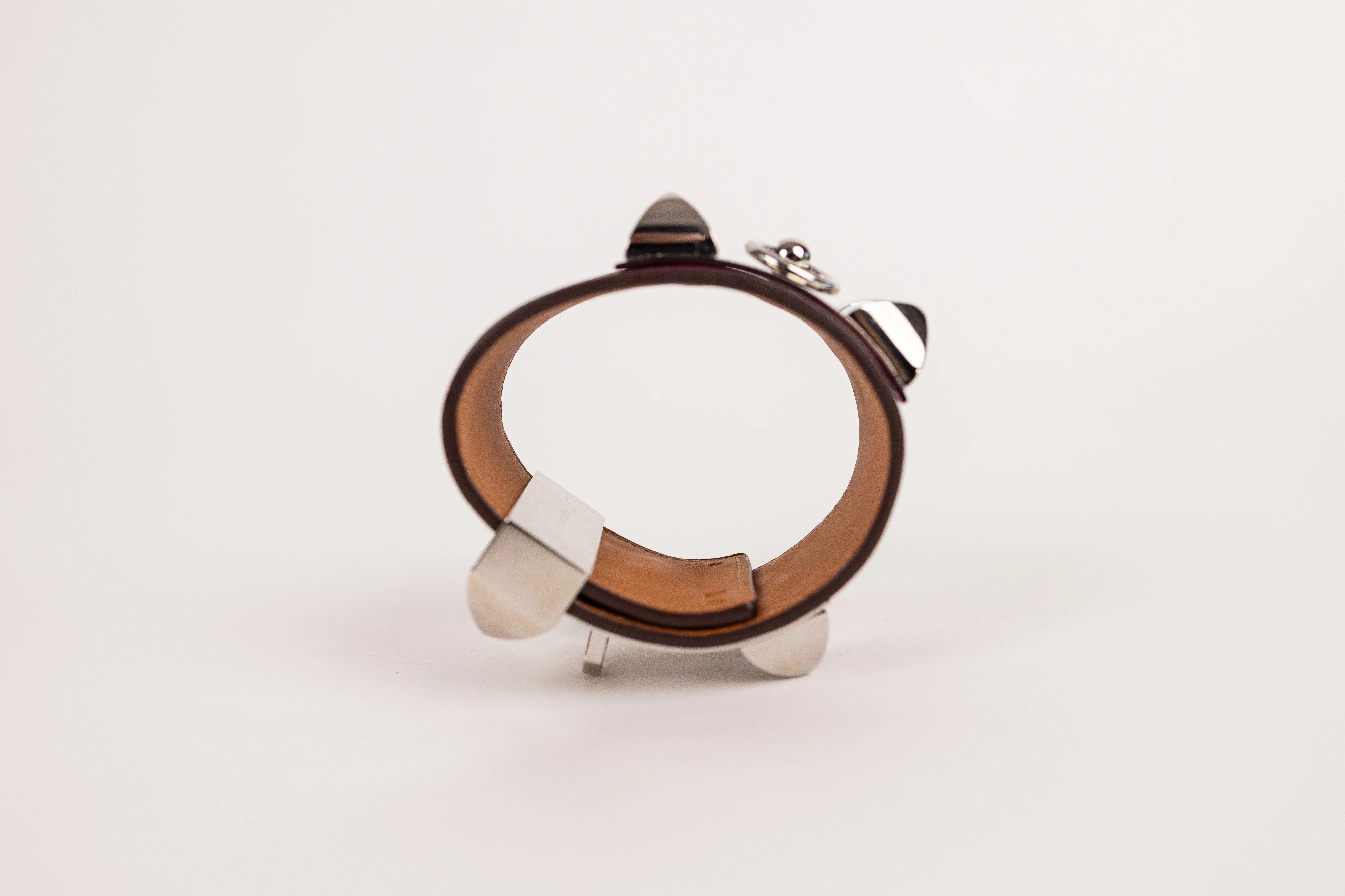 This Hermès Collier de Chien (CDC) bracelet is one of the house’s most iconic jewelry pieces, crafted in rich Tosca purple leather and finished with striking palladium hardware. Known for its bold, architectural design, the CDC features signature pyramid studs and an adjustable ring clasp. The wide cuff silhouette delivers a powerful fashion statement while showcasing Hermès' renowned craftsmanship. A collectible, timeless piece that elevates any look.